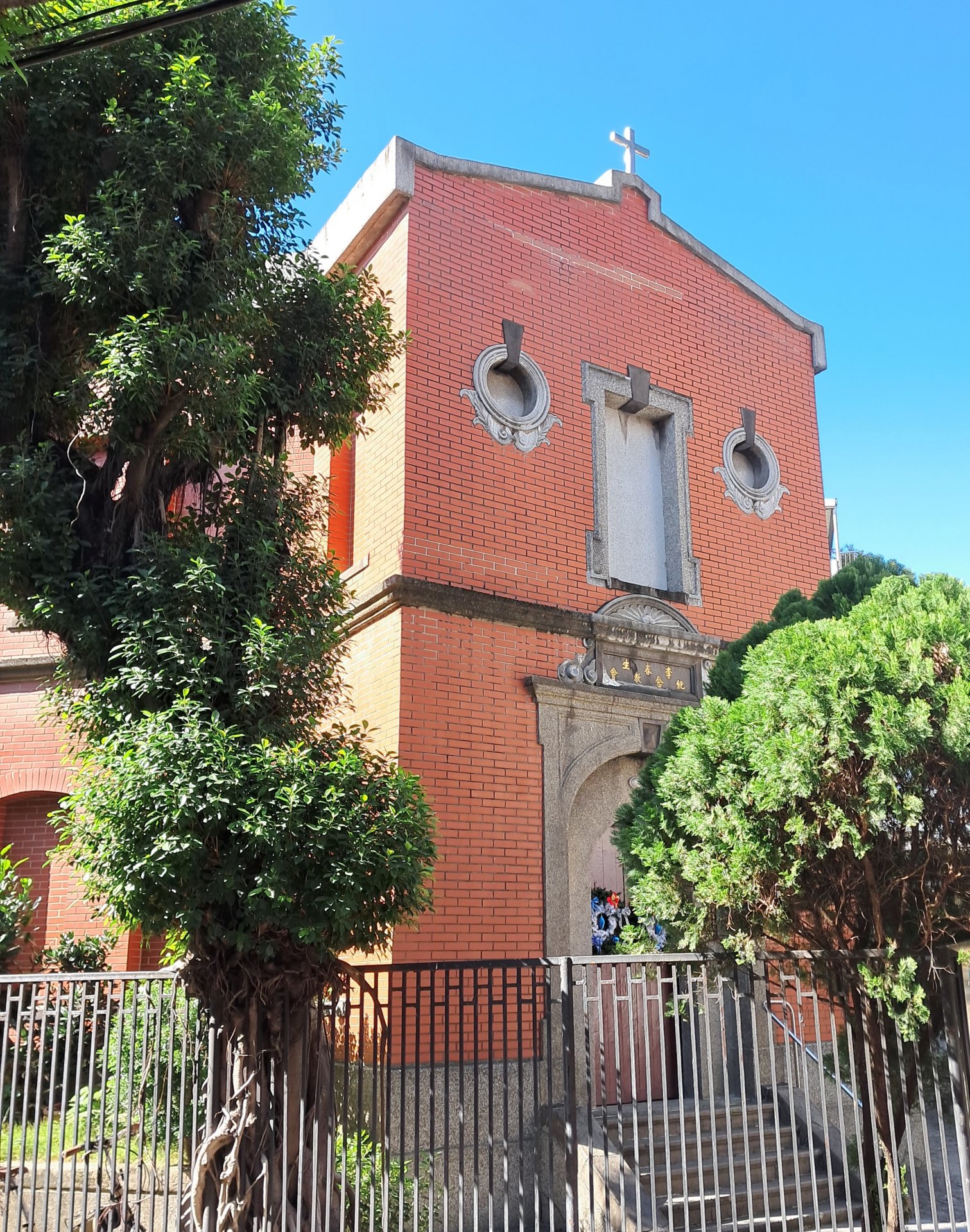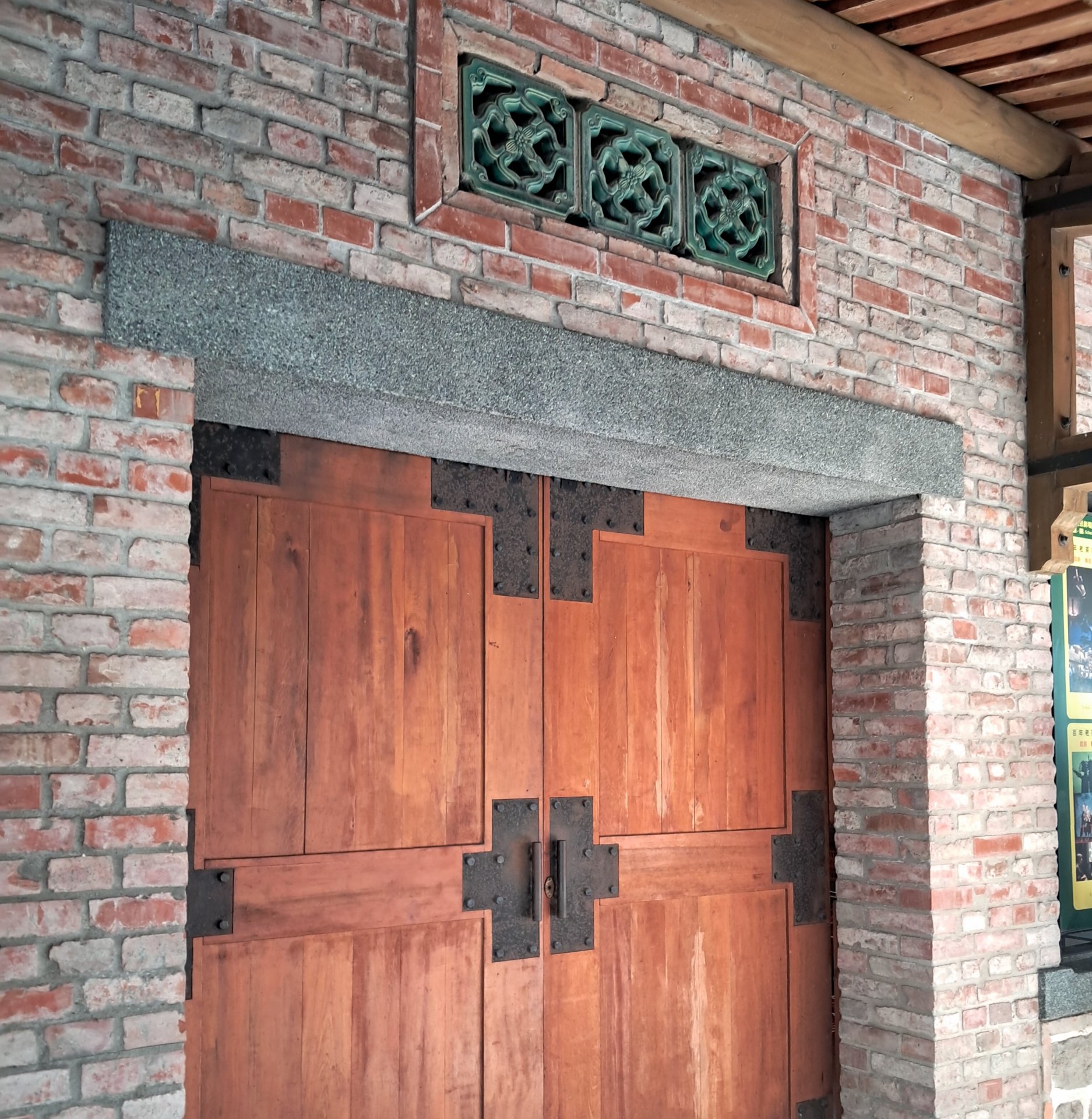 大門前的遮雨簷廊,由四根清水紅磚柱組成,下方還有石造的柱基。