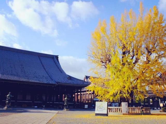 最先推薦的是距離京都車站不遠的西本願寺,雖然沒有豔紅的紅葉,不過西本願寺本身是以金黃色的銀杏聞名,在大家都爭先恐後的要欣賞京都楓葉時,來欣賞一下黃澄澄的銀杏也別有一番景緻!西本願寺中有一個樹齡快400年的「逆銀杏」又稱為「噴水銀杏」的老銀杏樹,傳說300年前京都一場大火中,保水力好的這顆銀杏在高溫的火災下蒸發出的水分像是噴水一樣保護了西本願寺,而有了「噴水銀杏」的名稱。