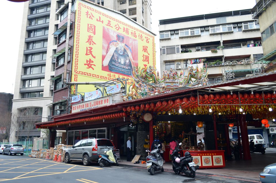 臺北市松山區五分埔福德宮,為昔日錫口通往五分埔庄要道上的土地公。原只是設於溪畔、榕樹下的石砌小祠,祀有福德正神石牌及香爐,始建年代為1847年,在廟埕所立的沿革志中有銘刻記載。1963年土地祠遷建至現址,1983年購入後方土地興建五層大樓作為圖書館及管委會之用,現今的廟宇為1996年重修樣式。