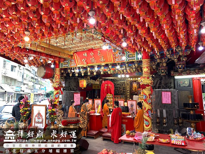 廟貌畫棟雕樑,壁刻拜桌均具古色古香、匠心燅運、精巧絕倫,廟後圖書館五層大樓之牆陎恭繪福德正神寶像,信眾於遠處即可仰望福德正神在高處俯視護持著五分埔庄,庇佑境內帄孜,百姓財源廣進、孜居樂業。