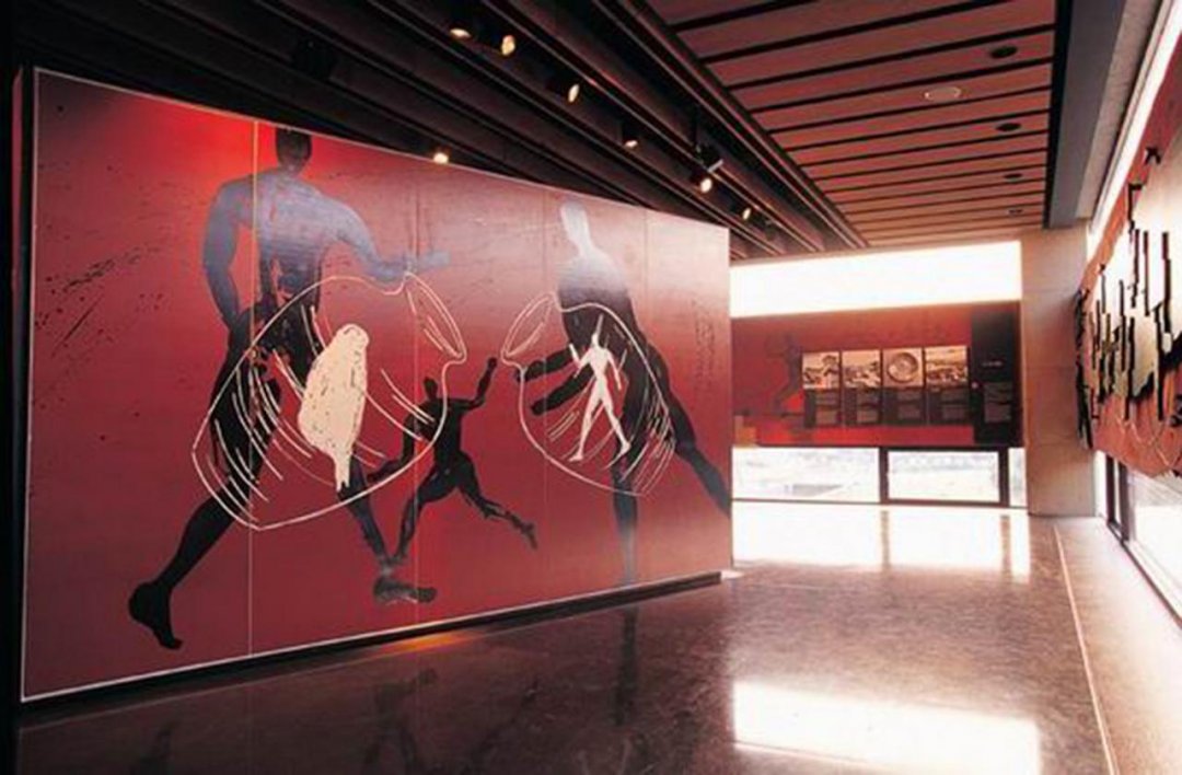 次によくご覧になっていただきたいのは、黒っぽい泥人形です。これは蘭嶼島のダウ族、つまりヤミ族の作品です。台湾の先住民の中で、ダウ族の製陶技術は数少ない現代にまで伝えられたものです。ダウ族は生活と関係のある陶偶をよく作りました。いとも簡単に陶偶を作り、生活の記録が生き生きと残されています。今皆さまがご覧になっている二人が抱き合う姿を表現したこの人形は、頭に蘭嶼特有の銀製の三角錐の帽子をかぶり、褌を身に付け、互いに押し合い相撲でもとってる様子には、蘭嶼の男性の造型上の特色が表現されています。原始芸術は、シンプルで自然な造型、天真爛漫で純朴なおもむき、飾り気のなさが特色です。陶偶を作ることは先住民にとっての楽しみでした。
