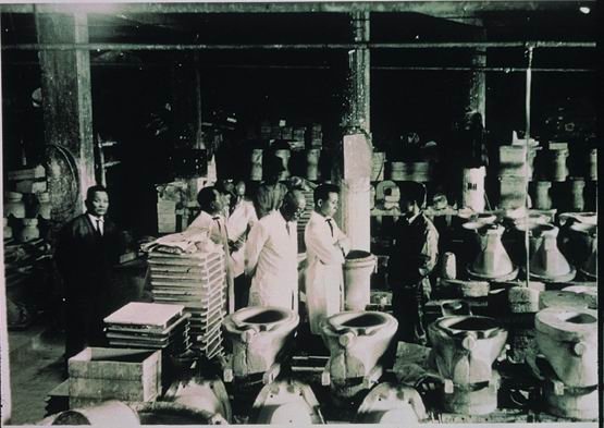 ここに展示しているのは、台湾の衛生陶器の発展過程です。昔のトイレは、屋外にある溝式の厠で、部屋の中は、夜用のしびんが置いてあるだけでした。日本統治時代になると、政府が衛生改善運動を推進し、清潔に保てるように、各地に衛生陶器設備を使うように要求しました。政策に従って、多くの窯場で陶器の和式便器と小便器の大量生産が始まり、機関や団体、学校などに供給されました。戦後は、邱和成の創設した「和成製陶部」が率先して腰掛洋式便器を開発し、最初の量産品は、台湾省庁に使われました。今日、台湾で生産されている衛生陶器設備は、種類も多く、美観と実用性も兼ね備えて、毎日の生活を快適にしてくれています。