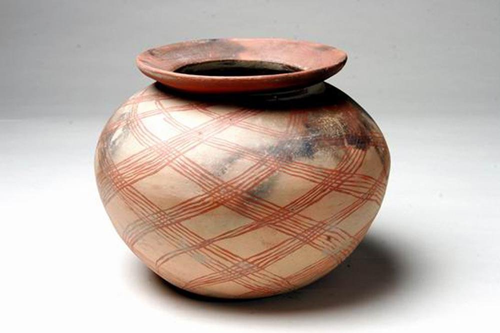 これは蔦松文化に属する鉢と陶器製の三脚台です。当時の人は三脚台で鉢を支え、煮たきしていました。下から柴を燃やし、鉢に水を入れてご飯を炊いたり、お粥やスープを作ったりしていたのです。この外面白い炊事道具に、アミ族の陶製の鍋があります。上下の鍋の真ん中に多くの穴が開いていて、下の鍋の水が沸騰すると、その蒸気が自然に上の鍋に伝わって、食べ物に火が通る・・・つまり現在の蒸し器なんです。「民は食を以て天と成す」と言いますが、昔の人も陶器を作る時には料理を作る実用的な陶器を沢山発明していたんですね!