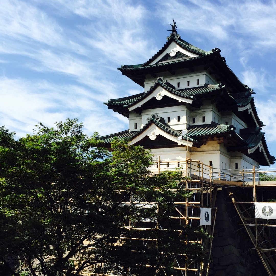 弘前城由第一代的津輕為信在1603年統一津輕地區的統一之後開始規劃,接著第二代繼承人津輕信枚在西元1610年開始建造,隔年完成。原本有五層的天守閣在建好後的十七年(1627)被雷擊中燒毀,照片中看到的是1810年時重建的三層建築,作為「弘前城史料館」對外開放參觀,展示十七世紀津輕籓政時代的歷史文物。1952年(昭和27年)被登錄為日本的國家指定歷史遺跡,也是日本東北地區僅存的江戶時代建造的古城。