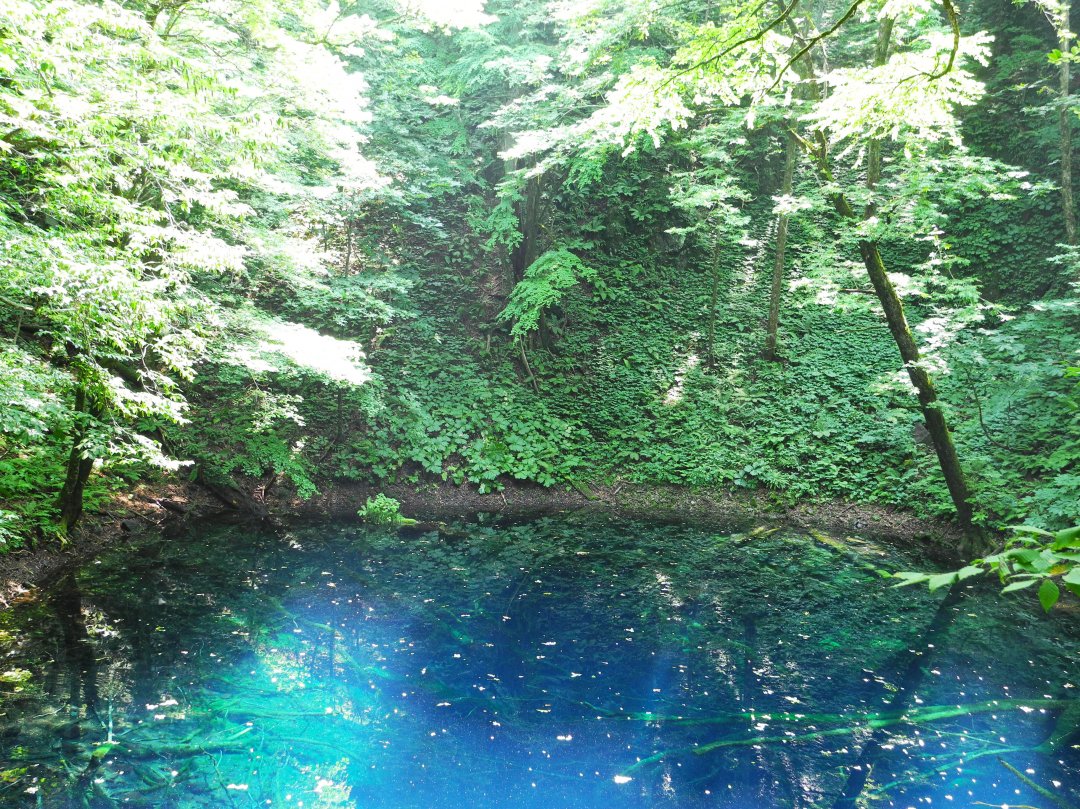 日本有兩個《青池》,一個是「北海道美瑛白金青池」(人工池)、另一個是這個「青森青池」(天然池),池水為什麼會呈現鈷藍色的原因到現在還是未知,神奇的藍色透著一股神祕感。春夏之際、正午之時,陽光灑在湖面上是最美的時候,湖深達九公尺,但湖水清澈如鏡,天氣好的時候還可以直接看到沉在湖底櫸木枯枝。