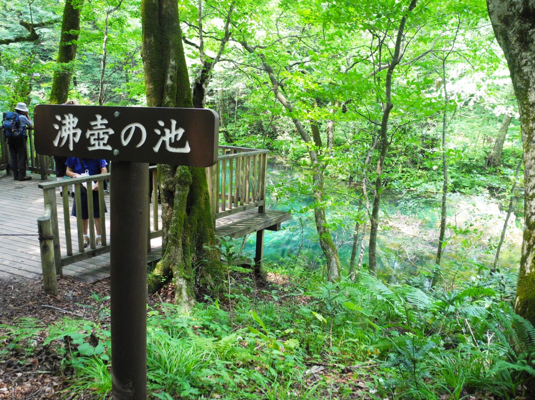 看完神秘的青池繼續往林道走不久會看到往沸壺之池的告示牌,接著就會到達沸壺之池。和安靜的青池不一樣,因為有地層高低落差造成的小瀑布,在抵達沸壺之池之前就可以聽到潺潺的流水聲,它的樣子和一池像是乘滿藍寶石的青池也不同,顏色比較淡,而且有淡藍和淡綠兩種顏色,池底一樣可以看見枯枝,陽光在不同地方映出的顏色變化萬千。