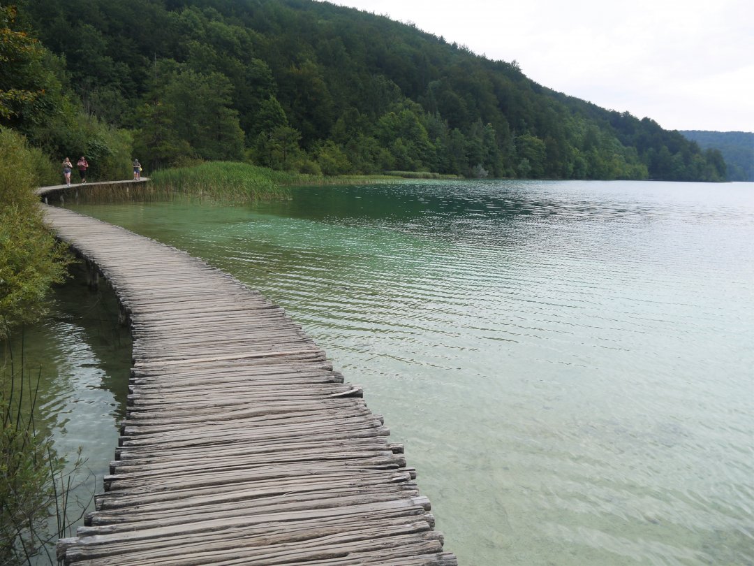祖母湖(Batinovac Jezero)的命名由來據說是有個老奶奶失足溺斃在湖中,湖的大小比起前三個大了一些,一樣是翠綠的顏色,離開祖母湖會經過一段兩旁都是參天大樹的平緩步道,接著就是Galovac 湖了,這是十六湖中的第三大湖,命名由來是一個打敗過土耳其人的強盜首領,後來被擊落在湖裡淹死。Galovac湖周圍的步道貼著森林而建,腳下土地和岸邊近在咫尺,水鴨和小魚不怕人地在一旁游來游去(國家公園的動物都禁止餵食),碧綠色的湖水和壓低的樹簷讓湖面感覺更開闊,Galovac末端又回到了湖上的木棧道,還可以看到湖中硬幣的閃光,也許是被當成許願池了。