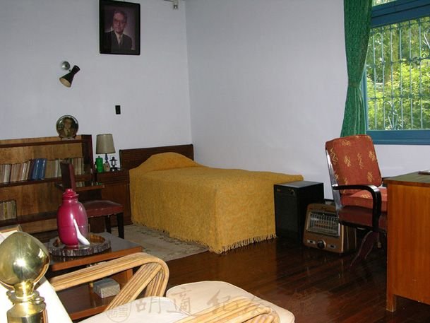 最後請大家多看一眼的是左邊的這間浴室,裡頭有一套現代化的衛浴設備,那是當時的政府從美國訂購送到臺灣的。請別忘記,五十幾年前的臺灣很少有沖水馬桶。這是當時的政府為了感念胡先生,從繁華的紐約回到台北相對偏僻的南港,特別送給胡先生的禮物。