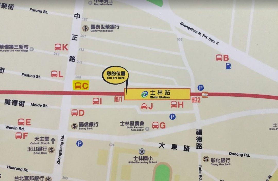 1.After leaving the Shilin metro station by exit1, and walk along the linear park, then turn right on Zhongzheng Rd.. There will be bus station C.