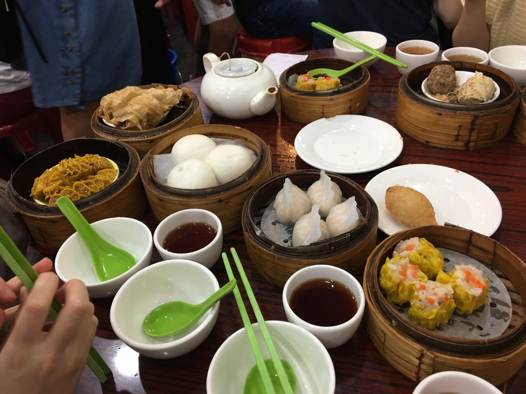 服務員將一大盆的熱水送過來,裡面放了餐具,並端來一壺滾燙的普洱茶,標準的港式飲茶餐前程序(在接下來的幾天都會像這樣),我姐經歷一番點餐的搏鬥和溝通之後,食物終於上桌了!