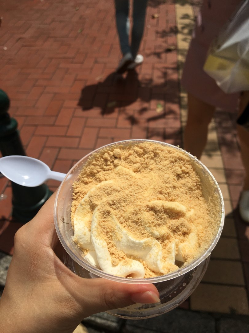 在官也街上閒晃發現了一家小店-必達士木糠甜品咖啡,正值炎熱天氣,我們點了一碗木糠冰來吃。木糠的口感有點像捏到很碎的餅乾屑,沒有非常明顯的香氣和甜味,但搭上香草冰淇淋口感特別~