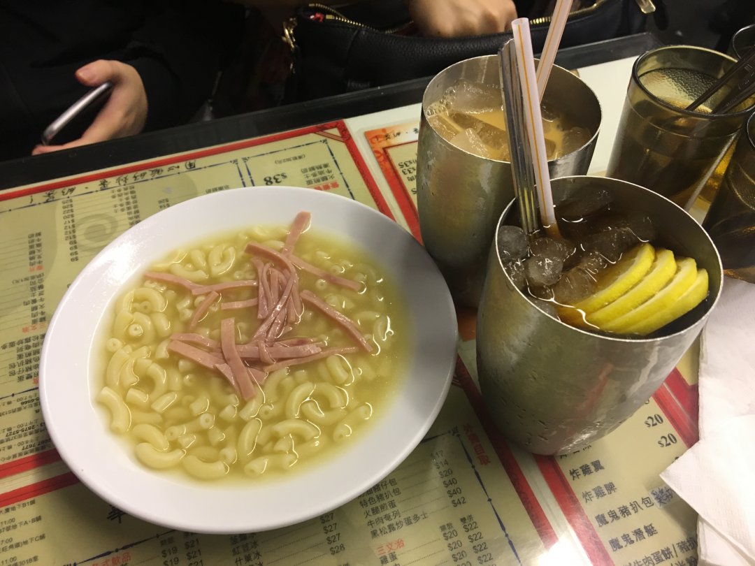 華星冰室分店眾多,我們吃的是旺角分店,冰室的風格摩登又懷舊,有些陳舊的裝飾,還有早期華星唱片的唱片封面掛在墻上,真的是很復古呢。我們點了1份早餐和1份營養餐。配餐是火腿通粉和煎雙蛋,華星冰室的火腿通粉讓我滿驚豔的因為上次來香港吃到覺得很怪,但這次吃起來異常覺得通粉和湯汁搭配得恰到好處,讓我忍不住一直吃。