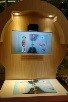 A:モニターのマネキンの前に立つと、当時の社会背景や服装の特色を紹介する映像が流れます。