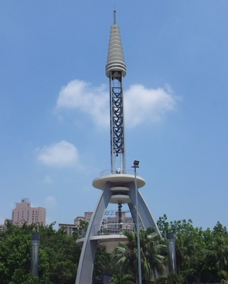 The overall form is inspired with the merge of the bow and arrow and spinning shuttle, referring to “the fleeting of time”. The top part of the tower is designed with elements that remind viewers of a Chinese pagoda. From top to bottom, the exterior is separated into four layers: light, sound, color, and water, each representing a different aspect of time. The most special feature is the water clock at the bottom. The clock is designed by French physicist Bernard Gitton, and has both scientific and artistic elements. The water clock has mechanical precision. Although the flow rate of the fluid changes, is clock is still capable of calculating time through the swinging of the pendulum. The fluid of the design has dual roles; it maintains the swing of the pendulum while displaying the hours and minutes.