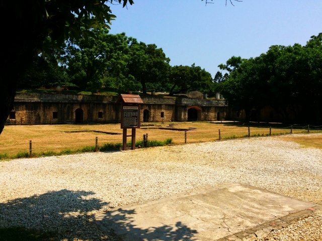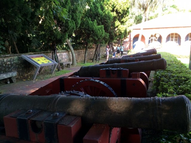 Hỏa pháo trong khuôn viên di tích, đa phần là do người Anh tìm thấy ở Đạm Thủy hoặc những khu vực khác, rồi đem sưu tầm những cỗ hỏa pháo này làm vật trang trí, nơi đây có thể thấy được pháo kiểu thời Thanh Trung Quốc và pháo kiểu Anh. Pháo của thời Thanh được tính theo đơn vị cân, gồm 500 cân, 800 cân và 1200 cân, vân vân… bên trên còn có khắc Thanh Gia Khánh, trong đó còn có pháo do Thủy Sư trấn thủ Hobe thời Gia Khánh để lại, thân pháo có khắc “ Gia Khánh thập bát niên hạ, phụng, hiến đào tạo Đài Loan, Bắc lộ Đạm Thủy doanh đại pháo, nhất vị trọng bát bách cân”