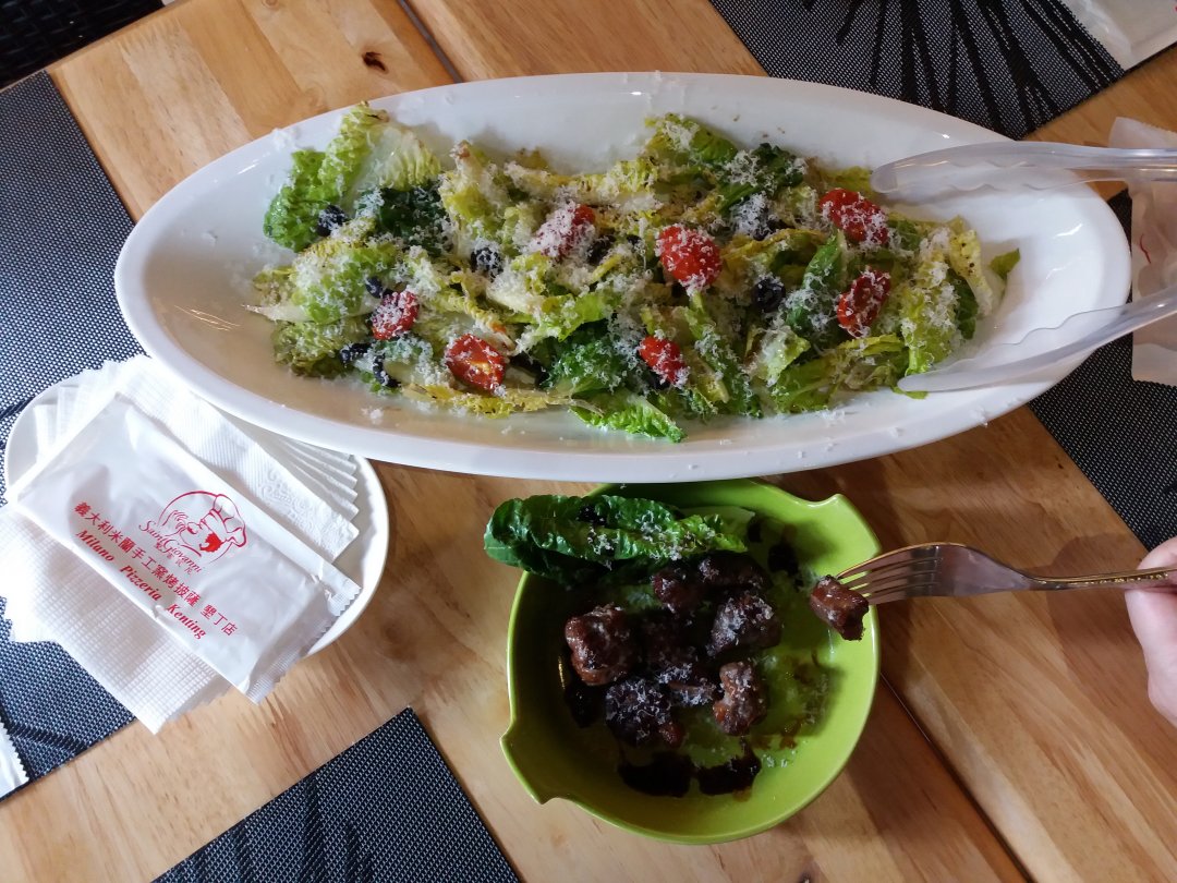 義大利米蘭手工窯烤披薩–墾丁店位於恆春轉運站旁,十分容易尋找。這間餐廳的披薩不同於一般我們吃到的,它的餅皮為手工製作,烘烤時是利用烤窯而非烤箱,因此入口時多了一股天然的焦香味,食材也都是真材實料,不論在視覺上或是味覺上都是一大享受。另外,甜點披薩也十分令人驚豔,本來以為冰淇淋披薩的餅皮會因為與冰淇淋接觸而軟化,沒想到仍是酥脆的!照片為兩人份套餐,第一張為歐洲鄉村沙拉與香烤牛肋條,第二張是法國油封鴨披薩,而第三張為草莓披薩。雖然價格不便宜,但十分美味,值得一來。