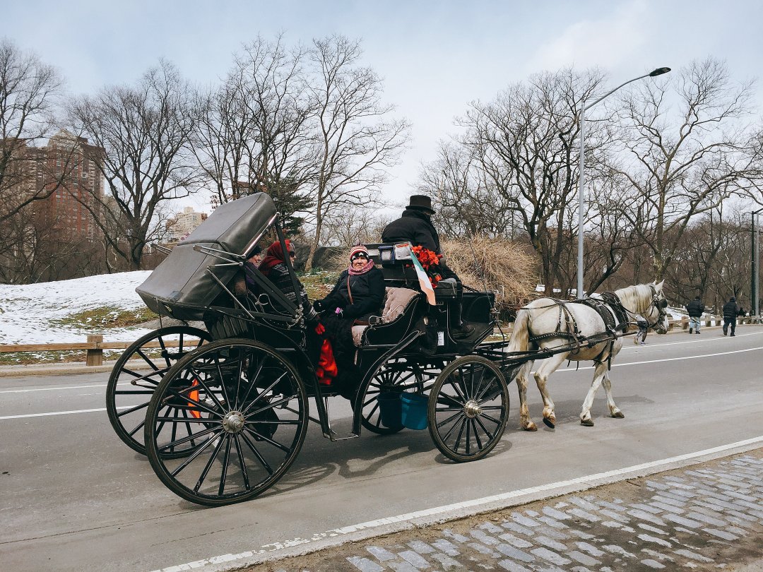 出了地鐵站,憑感覺走了兩三分鐘後,正納悶著怎麼都沒看到指標的我,突然發現了對街的數量馬車,本來以為是在舉行熱鬧的遊行,後來才意識到我已經身處於中央公園內了!