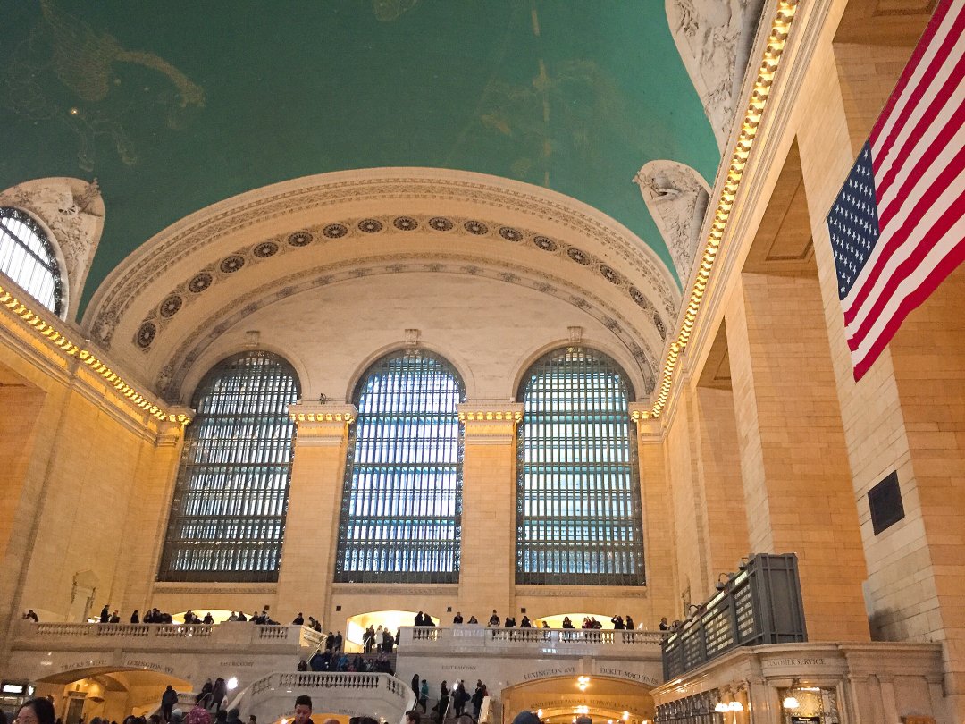 大廳內人來人往的繁忙程度毫不亞於燈光炫麗的時代廣場,高掛的美國國旗是在911事件後才放上的,象徵著紐約人共同的記憶與情感;天花板的壁畫也別具心裁,藍綠色的清新底色配上金色顏料勾勒出12星座圖。置身於大廳內,感受著川流不息的人群帶來的活力與朝氣,腦海中不自覺浮現了電影《幸運之吻》的最後一幕:女主角琳賽羅涵與男主角每接吻一次就更換狀態的時刻表,前一秒on time, 下一秒又變成delay。其實中央車站的火車時刻表還真沒準時過,顯示的時刻總是會比原定時間早一分鐘,這項貼心的設定是為了讓乘客有更充裕的時間趕上班次。