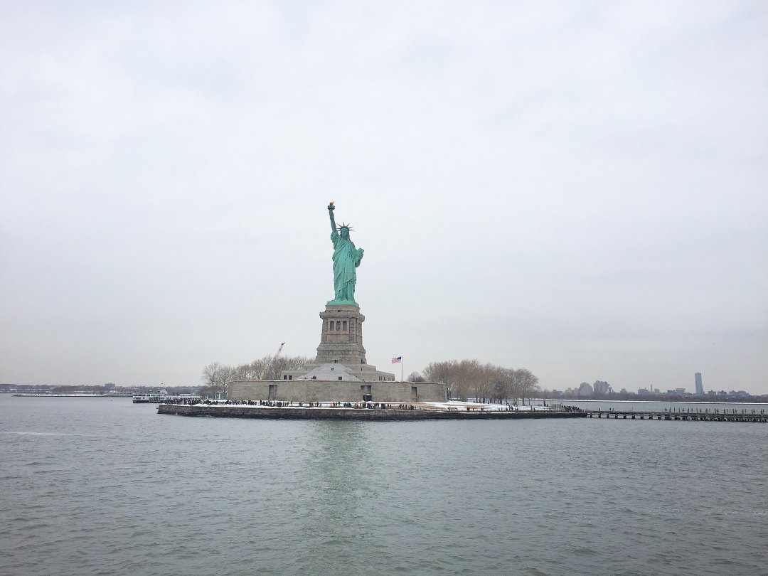 登島後,向工作人員領取免費的導覽機,就可以開始探索自由女神囉!參觀的那天剛好是陰天,霧茫茫的天空讓這天的自由女神多了點憂鬱氣息,雖然拍不出好風光,但也因為這樣旅客人數減少許多,逛起來顯得格外輕鬆。