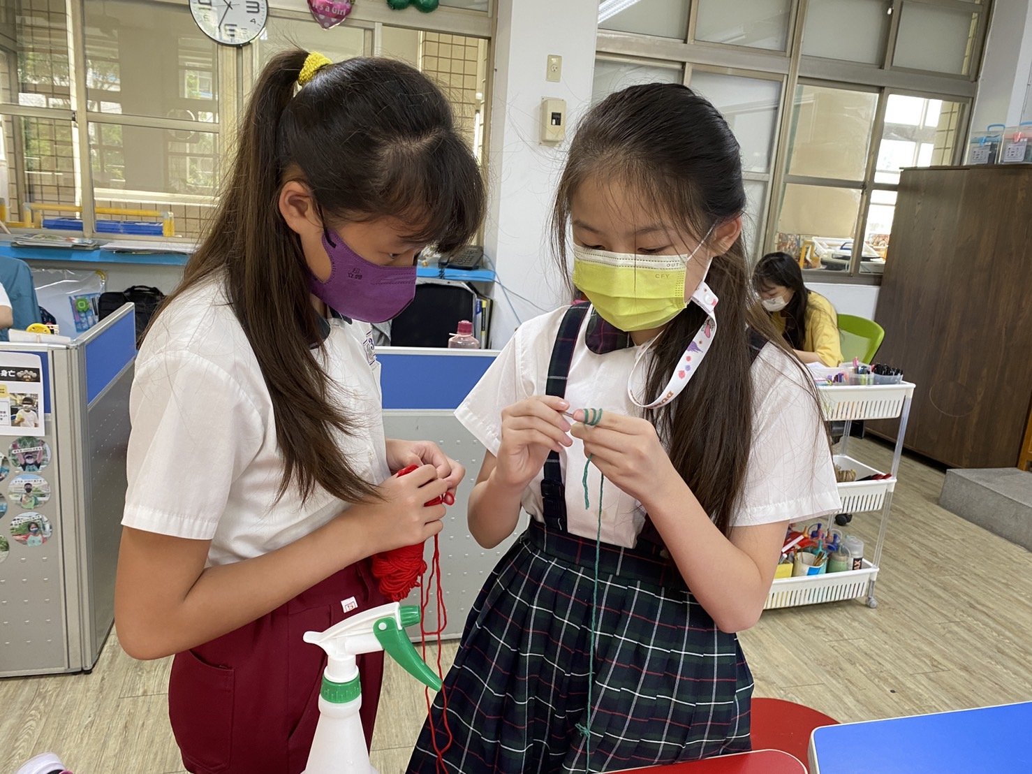 1. 在經過老師建議我決定和呂永晴一起合作完成這次畢業製作。一開始呂永晴的主題是電流急急棒,而我是編織,可是經過搜尋和考量,電流急急棒比較難做,所以呂永晴就改做紙箱,想要一起做一個關於市場的迷宮,在暑假期間我們再次經過思考,迷宮太大了,而且在短時間內做不出來,有點不切實際,所以她決定一起跟我做編織,可是她完全不會編織,所以我只能慢慢教她,可是她一開始怎麼教都不會,所以我就罵了她,她說我好兇,不想學了,我只能叫她不能放棄,她才繼續學,終於她學會了!我們可以一起編織蔬果趕進度,我們每個禮拜都會編東西,老師也會問我們這禮拜進度是什麼,目前我們已經編織很多東西,塞滿了櫃子。