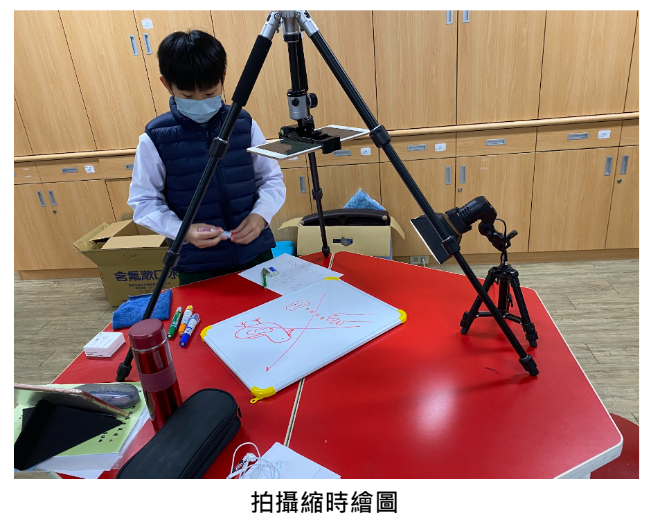 創作媒材:我的影片是用定格動畫拍攝,道具是用紙箱、吸管、色紙和黏土來製作,很多元。影片解說部份是用縮時繪圖的方式,拿百板筆在白板上畫圖,最後再縮短時間並且加入聲音解說