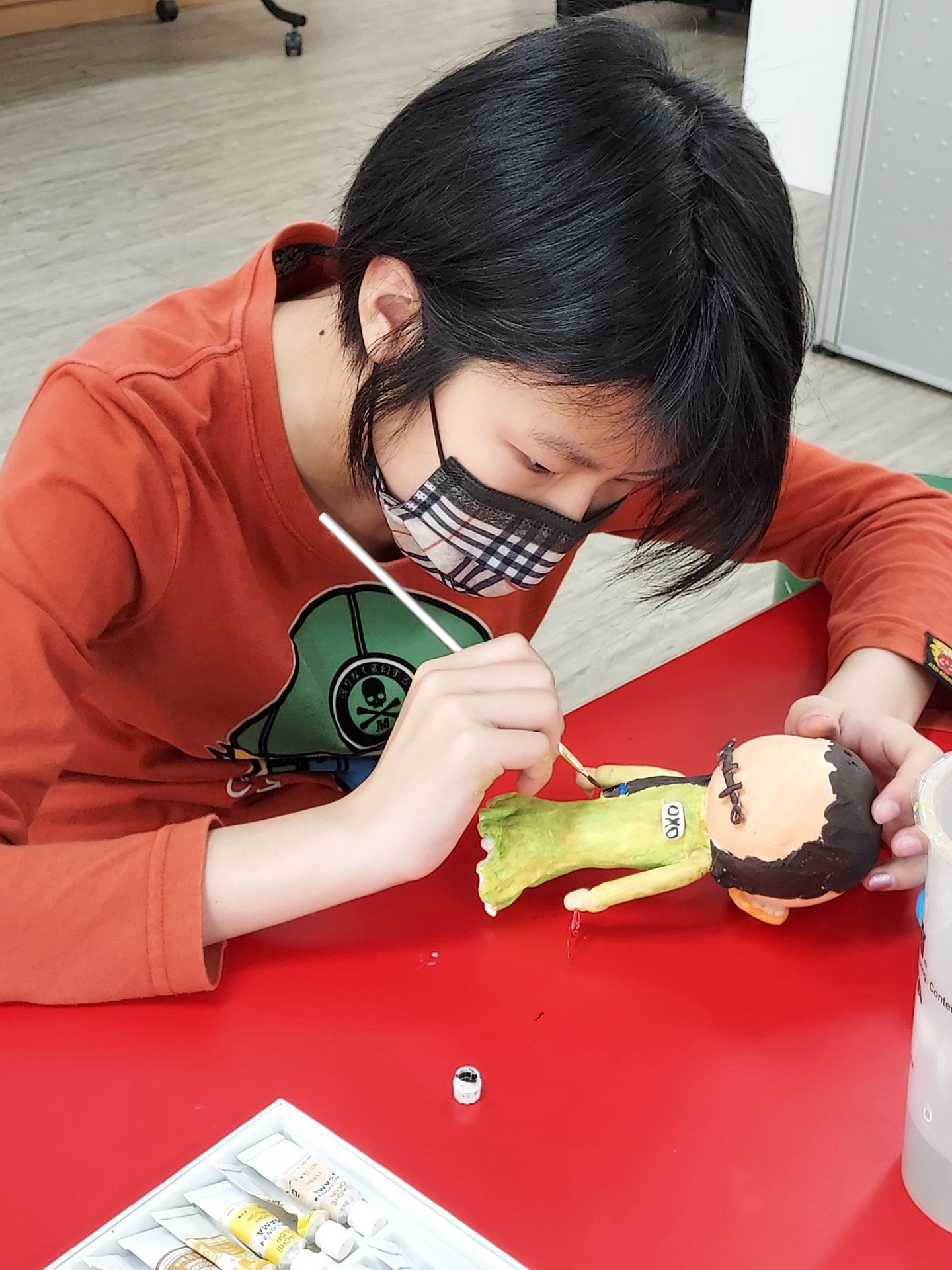 我訪問一些創造力資優班的學生,結果每五個人就有兩個人被誤會過,被誤會的部分有數學要很好、要很聰明、想法要很多….等。所以我依據這些訪談內容設計五個介紹創造力資優班的公仔,分別代表學記簿之請記得我的長相、創造力班老師之放心放著、原班老師之是天生的、學生隻我們不需要不一樣、蛋糕之千層蛋糕。我使用的材料有輕黏土、紐彈殼、鐵絲,竹筷、PP版。