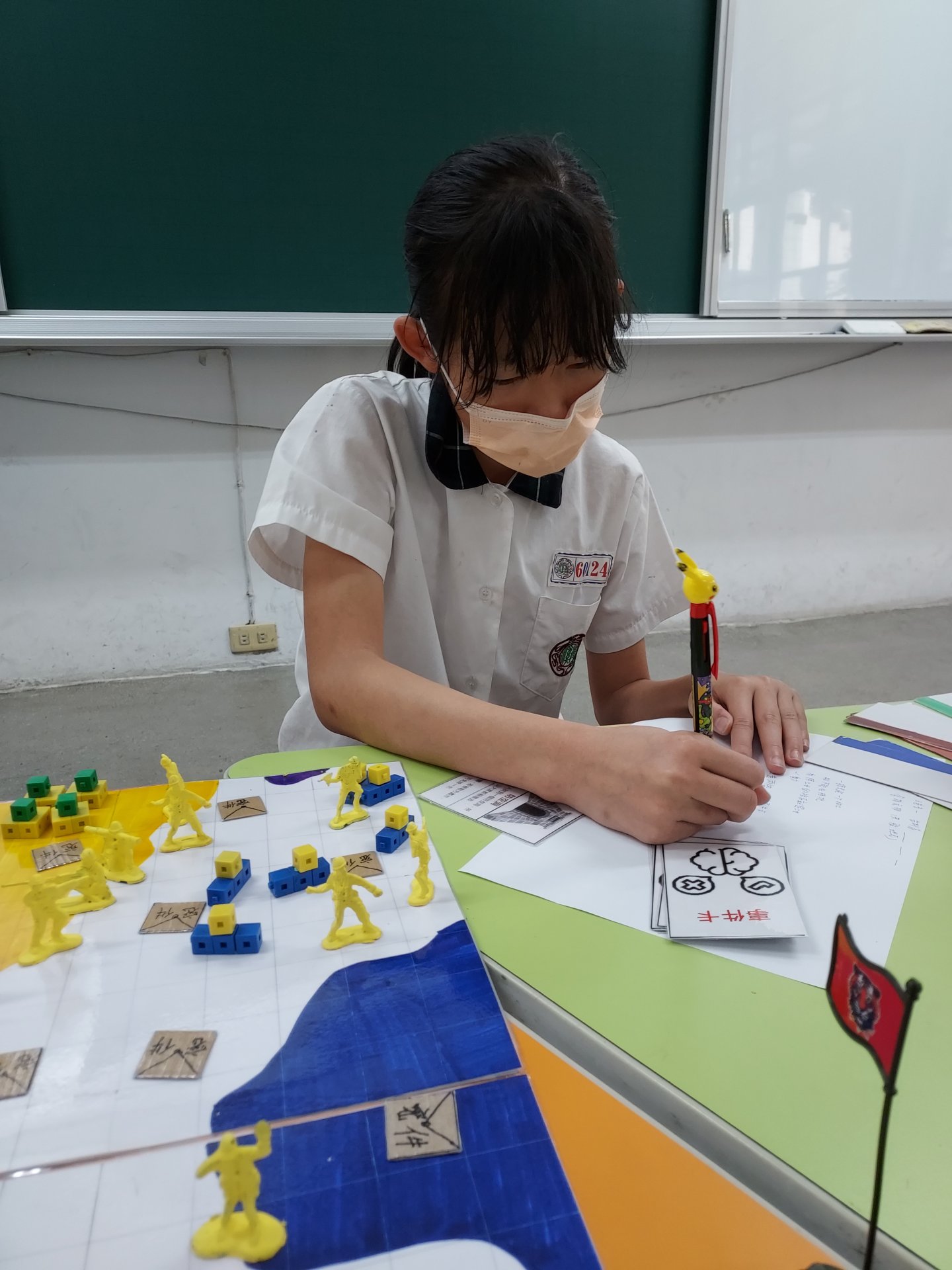 我的創作媒材大部分是紙,在電腦上打完後印出來,然後再用拷貝機拷貝這是卡牌跟底版的材料,再來是軍艦跟戰車,都是用小方塊拼成的,軍人都是用買的,再用油漆染成國家的 顏色。轉盤是自己DIY的。
