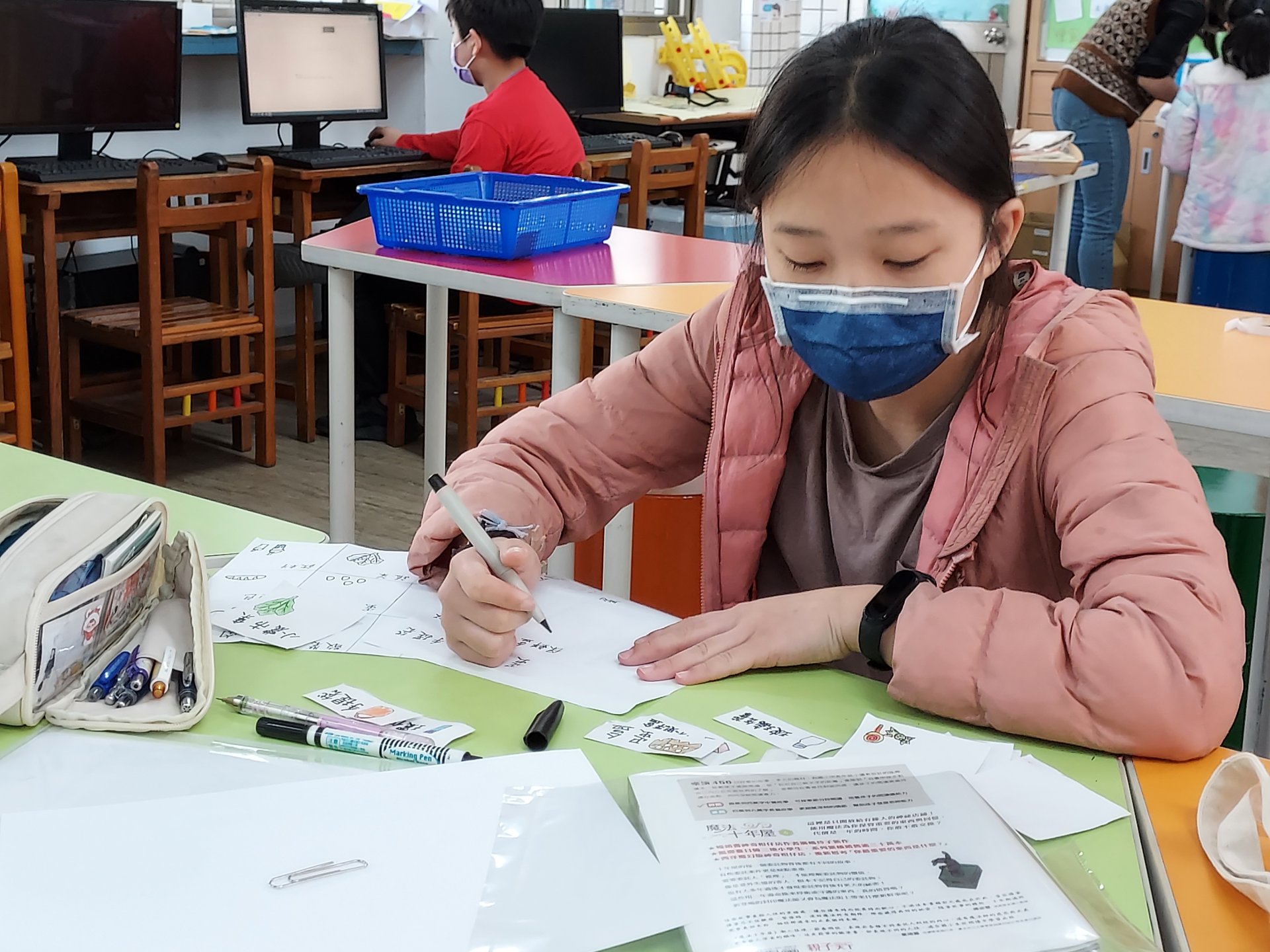 我為甚麼會這樣做呢?為甚麼不在廢紙上畫完就把廢紙丟掉畫在厚的紙上?因為廢紙可以先當草稿,畫完後黏上去可以增加厚度,如果直接畫在厚的紙上的話,在用奇異筆描邊時畫錯就是丟掉厚的紙,而且厚的紙重複畫的話會有痕跡,在用色鉛筆塗色時就會有些地方圖不到顏色。