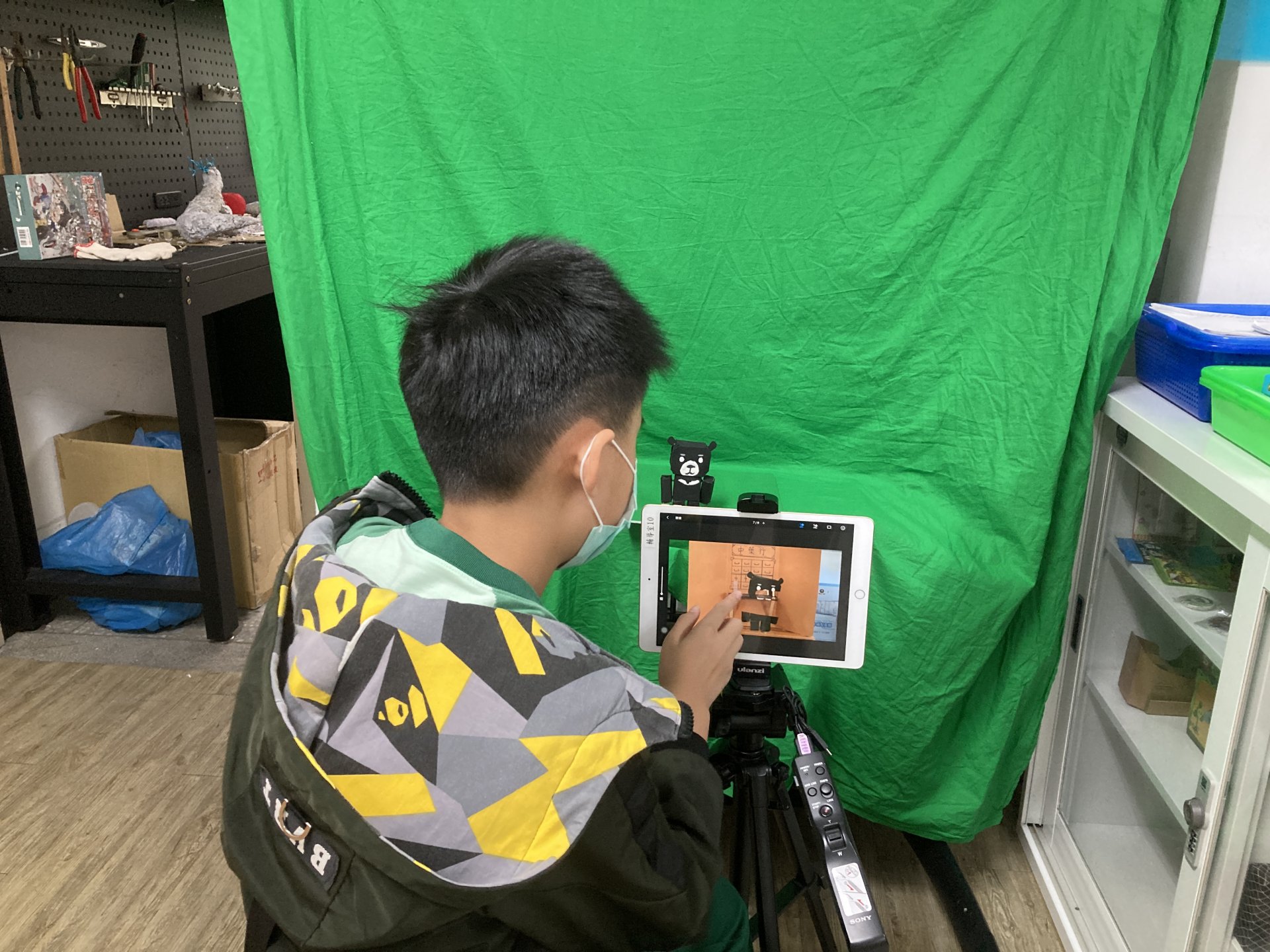 2.在定格動畫拍攝時不能動,否則會有誤差,我因為這樣而重拍了好幾次。所以我用家裡的紙盒把平板架起,這樣就不會一直亂動。後來我在決審時從評審老師那裏得到了解決方法,可以用裝水的水壺加上隨意貼來固定好鏡頭,而且評審老師說如果鏡頭動了,可以直接切換到另一個鏡頭,不用一直拍同一鏡頭