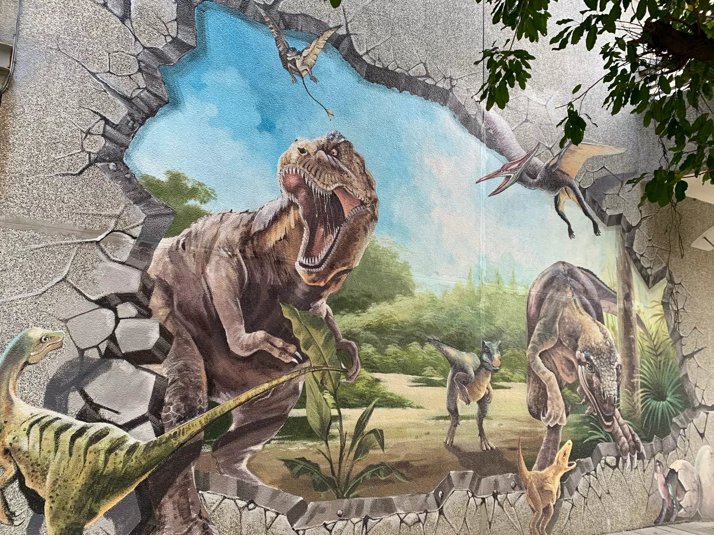 這是一副神秘又魔幻的恐龍牆,有一天有一位旅行者從旁邊路過,突然有一隻畫裡的小恐龍跳了出來,搶走旅行者掛在脖子上的幸物,就跳回牆裡,旅行者想拿回自己的幸物,也跟著跳進牆裡。