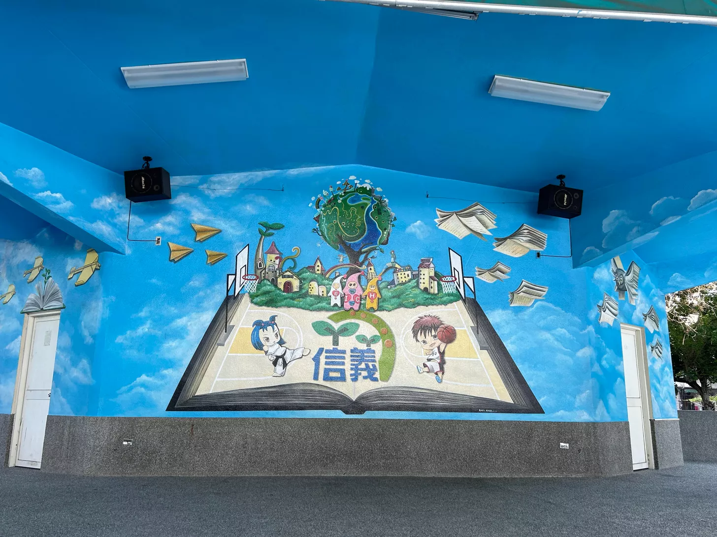 你走著走著走到了操場,映入眼簾的是一個足球場.籃球場以及跑道,籃球場和跑道都是採用藍色系的讓人想起無邊無際的海和天空,具有吸引力,雖然現在沒有學生在那,但卻始終感受的到有學生在這運動時那朝氣蓬勃的樣子,您走進了操場,發現在籃球場內還有一個司令台,司令台上有著信義的logo,以及信義的娃娃還有兩個有朝氣的運動員!一位是正在練習跆拳道的女孩,另一位是個正在打籃球的男孩,你看到了這個後你的耳邊突然出現了兩個很有朝氣的聲音,你馬上的轉過了頭視線中突然出現了那兩位運動員!這時打籃球的男孩看見了你,男孩熱情的向你招了招手,男孩把籃球丟向了你,你被男孩的籃球嚇到了,就在籃球要丟到你的前一秒,你緊張的從床上彈了起來張開了雙眼,緩了緩後你看了看四周這才驚覺剛剛的一切都是夢,那個夢十分的真實,讓你回味無窮,這讓你決定這就立馬動身去看看夢裡的「那個信義」是否真的是那樣子,還是那只是夢想以及夢境而非事實。