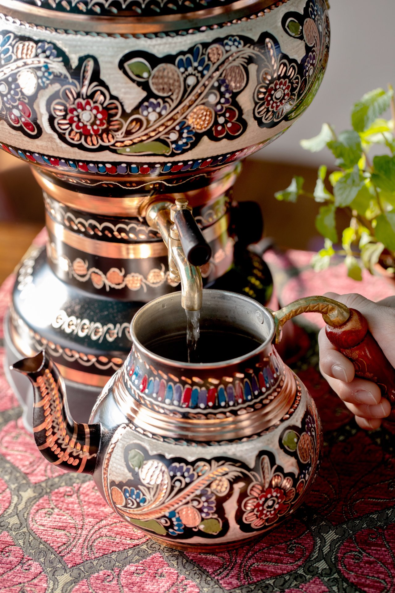 在空間中裝飾著被土耳其人視為招來好運的「藍眼睛」飾品,滿滿好運的圍繞下,以精緻的子母壺炊茶後,依照個人喜好加入糖塊,喝著小蠻腰杯裡的琥珀色濃紅茶,品嚐土耳其人「一日不可無茶」的浪漫。
