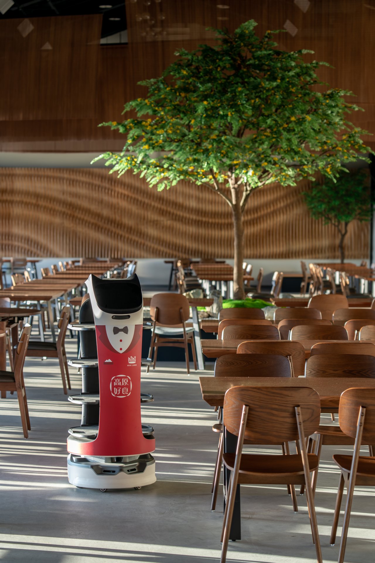 館內必吃美食都在《客茶樓》中餐廳。從大門就能感受到寬敞大氣的空間裝潢,左側大面落地窗可一覽綠意延綿的風光;樹景植栽讓餐廳融入自然元素,天花板垂吊的帶狀竹簾,堆疊出簡約靜謐的氛圍。貓咪造型的機器人穿梭於餐桌間送餐,萌翻大朋友小朋友。