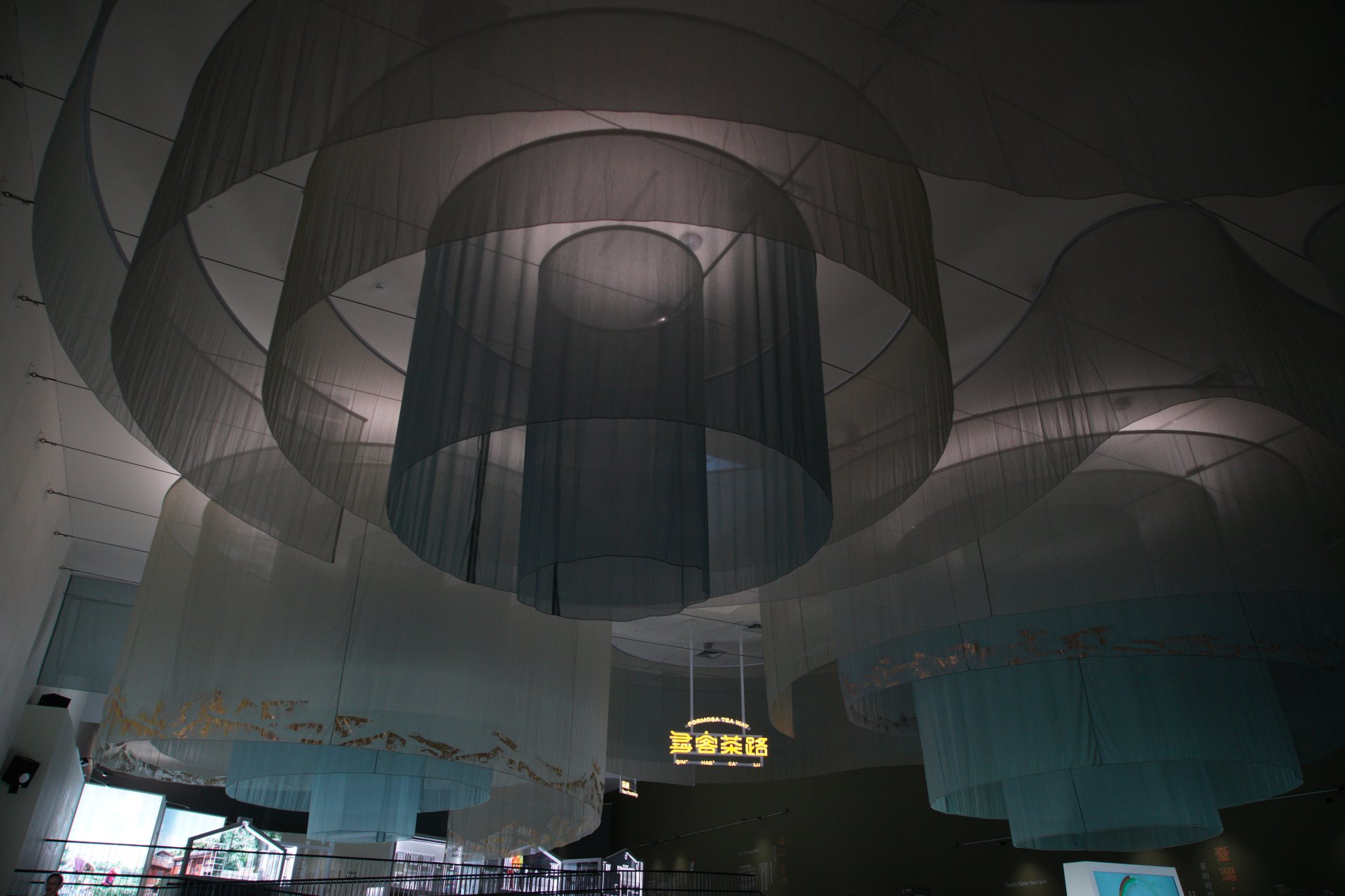 目前在您眼前的是「天光大廳」,其設計意象參考早期客家人在保存糧食的陶甕,以及採摘茶葉時使用的竹簍。保留天井的設計代表著客語中的「天光日」,帶有希望的曙光、期許明日晴朗的語意。