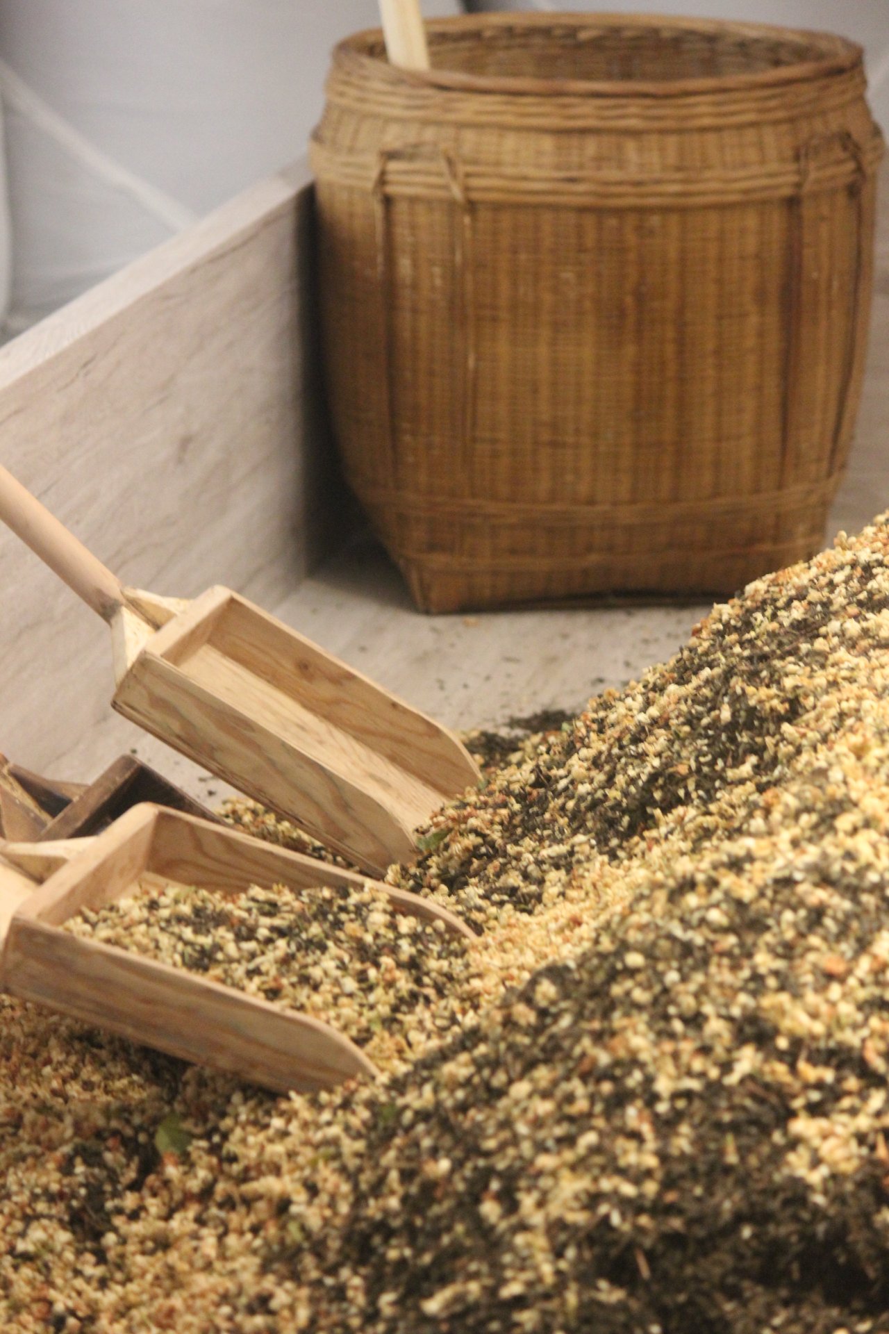 3. 茶花拌和:茶與花的直接接觸,充分吸香與調香。茶花拌和多用手工操作,大中型茶廠普遍使用審花拌和機。