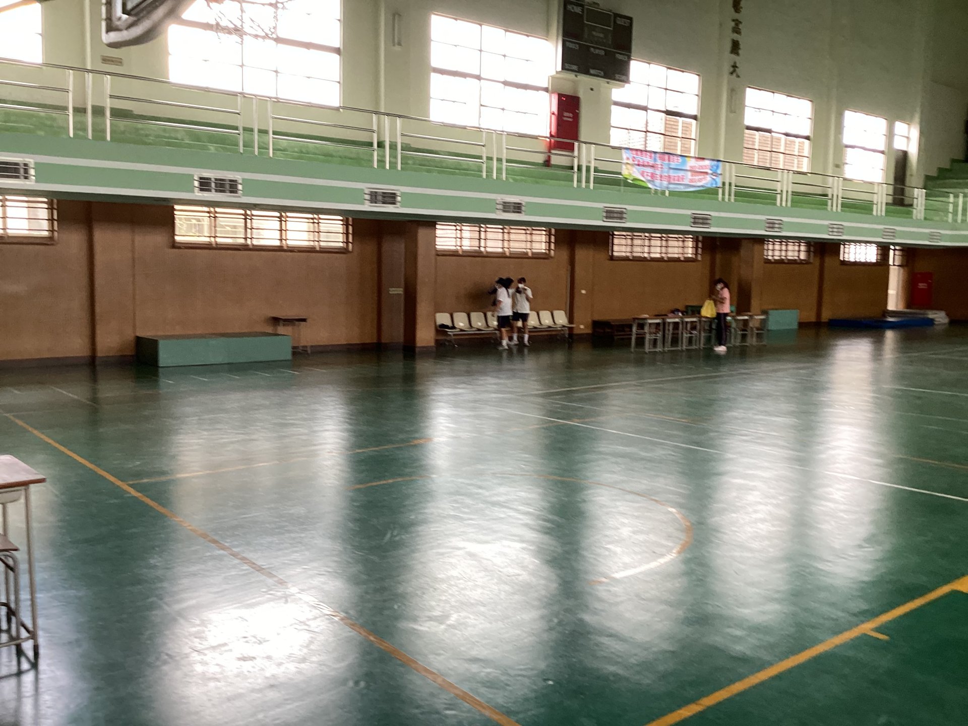 體育館內有桌球室、健身房、練舞室、羽球場,那裏也是給學校校隊練習的地方,眾所周知屏榮的排球隊蠻強的,每次都看到它們在努力練習,有努力就有收穫屏榮特別的是有武術課,在校慶的開幕裡學長拿著旗子表演,他表演的英姿超帥的,在這之後還有舞龍舞獅,她可愛的表演馬上吸引了大家的目光,開場的表演瞬間炒熱了氣氛,屏榮的體育館裡充滿了學長姊的汗水,他們為了精采的表演,而努力練習。