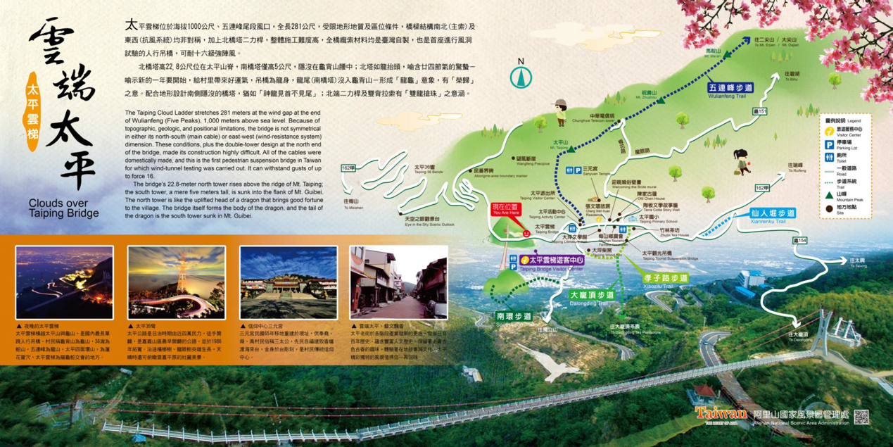太平雲梯位於海拔1000公尺,五連峰尾段風口,全長281公尺,受限於地形地質及區位條件,橋樑結構南北主索及東西抗風系統均非對稱,加上位於雲梯入口處的二力桿,整梯施工難度高,全橋纜索材料均為台灣自製,是首座進行風洞試驗的人行吊橋,可耐16級強陣風。