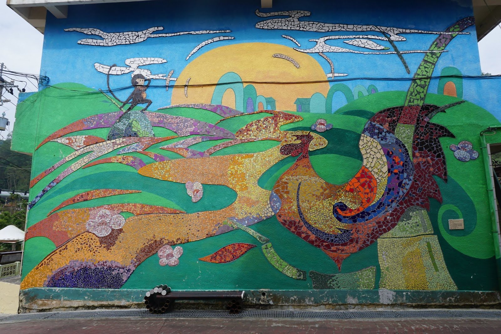 進入老街會看到一面馬賽克壁畫,創作來源是以張文環作品中的閹雞及夜猿來作為創作理念,這棟建築就是太平村的活動中心。
