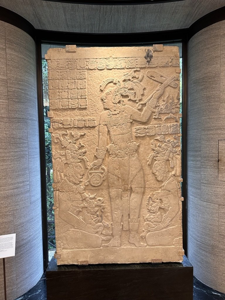 The ruler of Palenque, K'inich K'an Joy Chitam, dances as he impersonates the storm god Chahk. He wears Chahk's costume, and carries snakes and a water pot, symbolizing lightning and thunderous rain. Dance, a central part of many public performances, was thought to facilitate contact with supernatural beings and ancestors. Appearing on either side of the ruler are his parents. His mother carries the snake-footed god while his father holds the Jester God, a symbol of royal lineage.