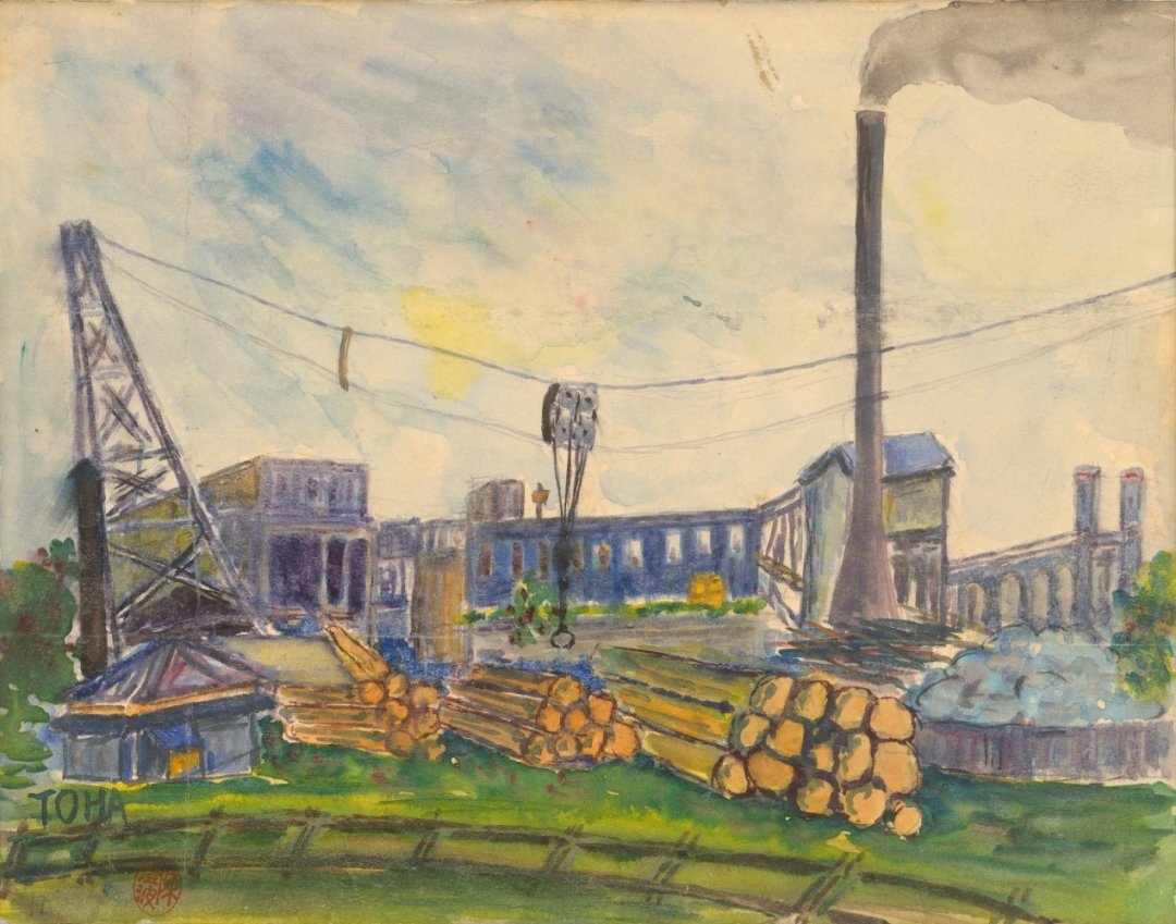 座式起重機在軌道上來回移動,伸向貯木池的懸臂垂下吊索,隨時準備搬動池中的巨木。除了標誌性的天車之外,根據史料記載,製材場中還存在著一具荷重三噸、蒸汽動力的德製起重機,或許也就是陳澄波所描繪的這具機械。