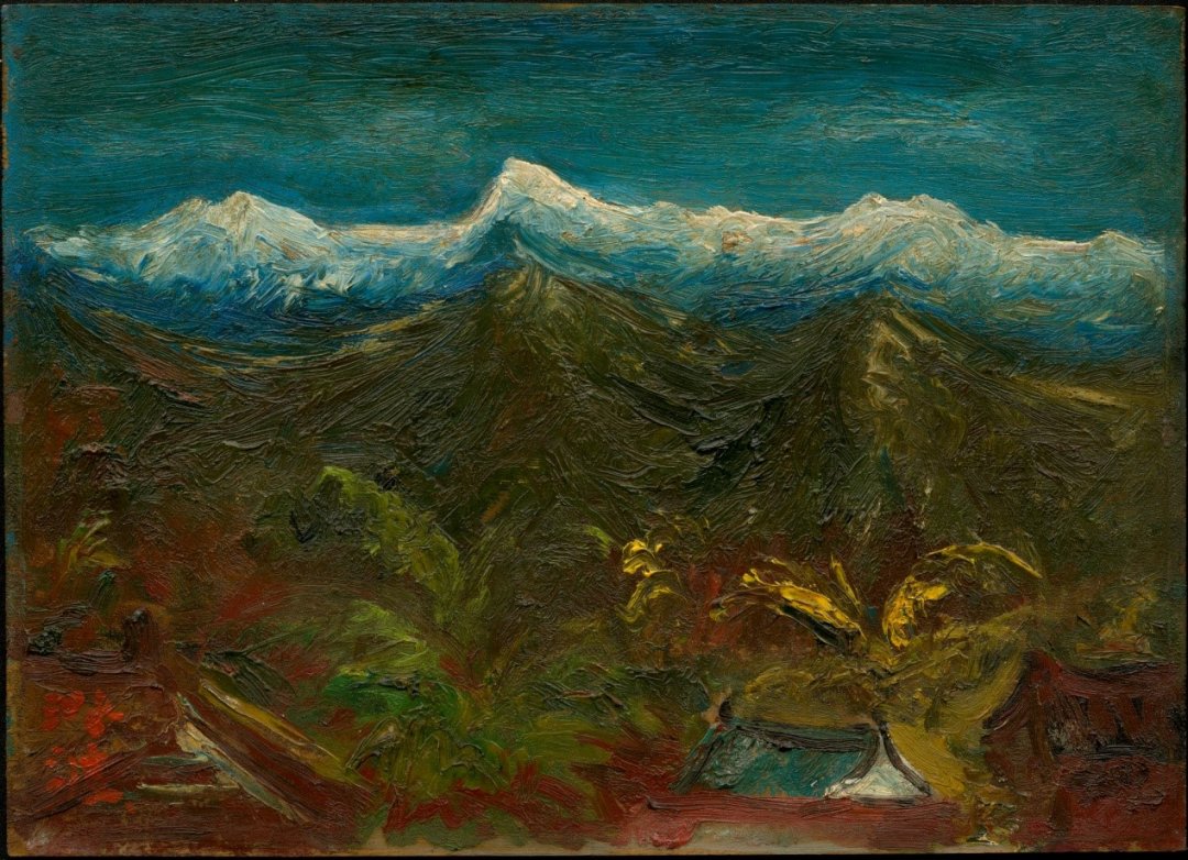 赭红色的土地,蓊鬱蒼翠的峰巒,覆蓋山脈的珂雪,靜寂而晦暗的深藍色天幕,沉邃莊嚴的氣韻,澱積於一層層厚重的油彩之中,堆疊成畫家對自然世界的崇敬與禮讚。