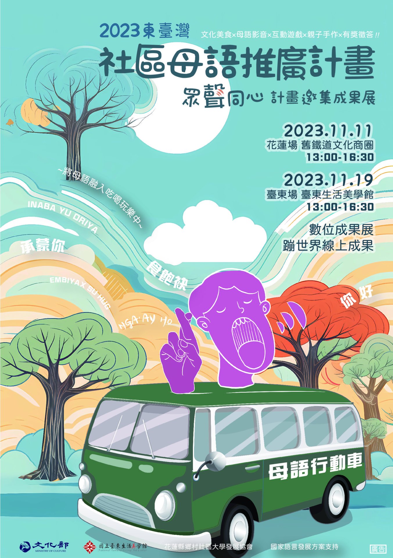 「2023東臺灣社區母語推廣計畫」成果展移師台東,在國立台東生活美學館登場,展示本次推廣計畫在台東地區22組提案多元且豐碩的成果。本次提案推廣的語言包含台語、客語、原住民語及特殊語種,並運用飲食記憶、童玩、神話傳說及傳統知識等主題,設計推廣方案。成果展現場設有25個攤位,透過教材展示、繪畫體驗、音樂創作、手語互動、對話教學等形式,展現推廣成果。
