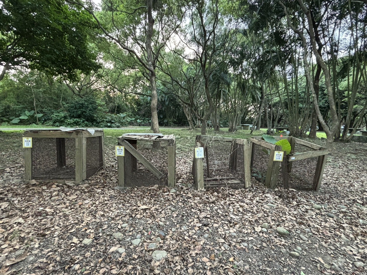 這裡的堆肥箱有四個,它們其實是搭配科學的實驗課程,包括:加底加蓋、加底不加蓋、不加底加蓋、不加底不加蓋等四種變因的操作,實驗的目的在清楚地看出枯枝落葉腐熟的差異比較。