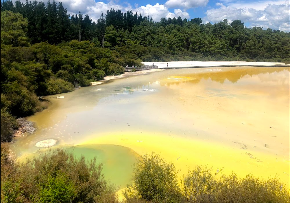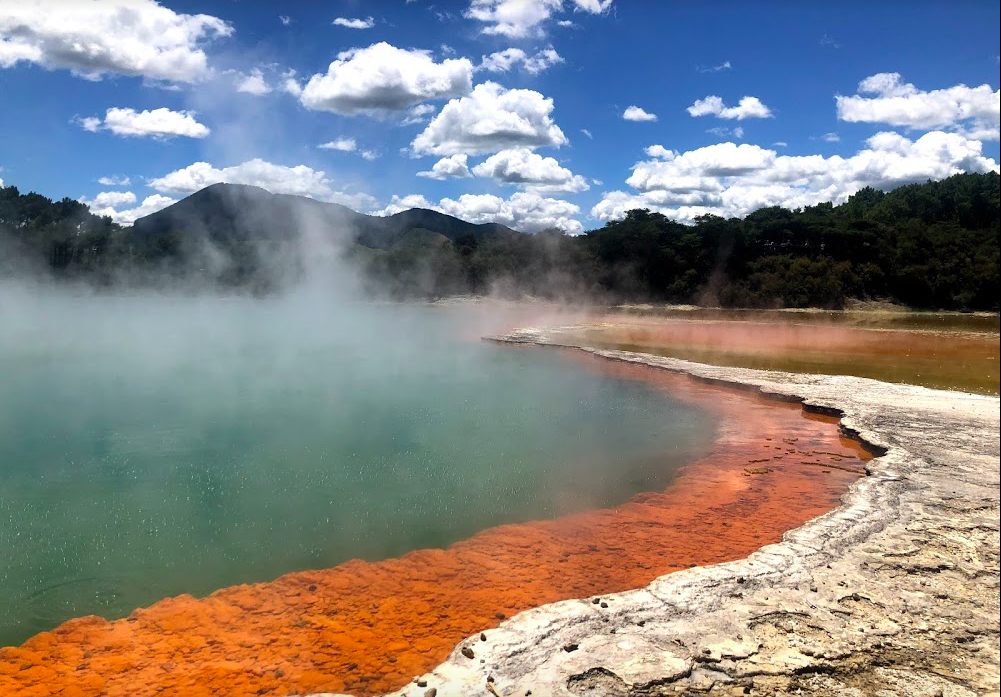 照片中的景點是Champagne Pool香檳池,因池中礦物質相當豐富,包含硫磺、矽、砷等,使得池水呈現外橘內綠的顏色,搭配蒸騰的熱氣,儼然就是個人間仙境。