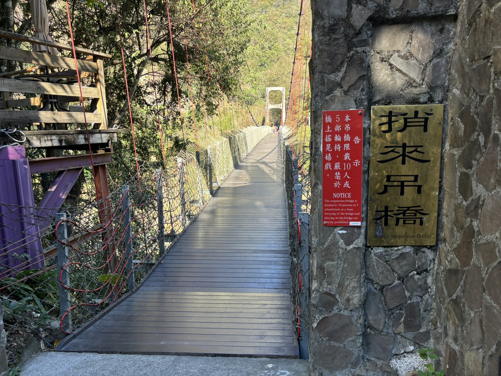 這是通往捎來步道西入口的吊橋,您或可選擇爬趟步道運動一下。漫步在吊橋上,還可以看到溪流中閃亮亮的苦花魚,那是它側身啃食青苔的鱗片的反光呢!
