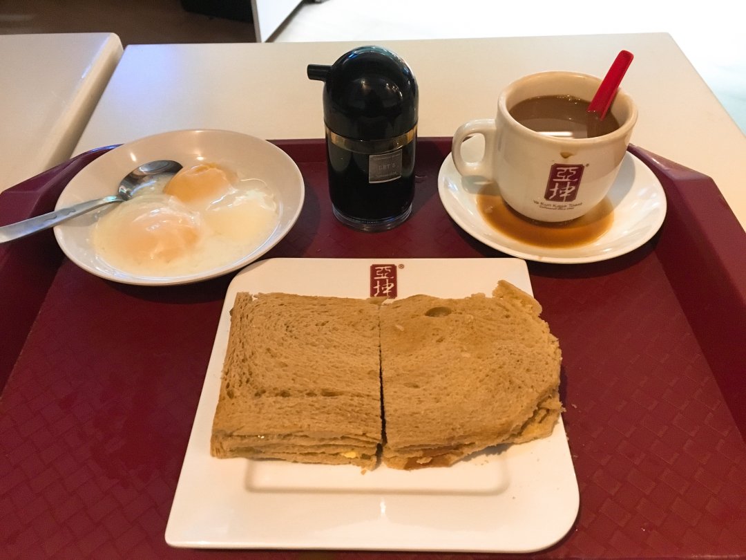 我點的是Set A,共4.8 SGD,總共有兩片咖椰吐司、兩顆半熟水煮蛋和一杯熱咖啡(可以替換成奶茶)。重點來了,在吃半熟蛋的時候,可不要傻傻的直接喝下去喔!記得要加上一旁的醬油,再撒上點胡椒調味,不然直接吃的話味道可是很腥的。