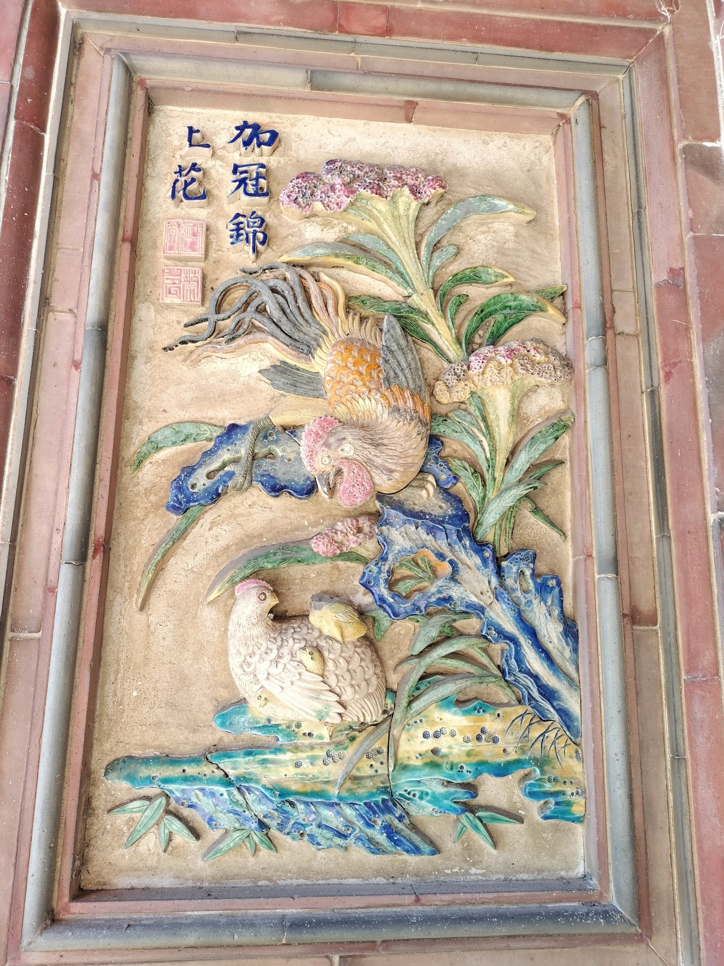 此交趾陶的獨特之處在於其精巧的雕刻,以雞冠花、公雞、母雞、小雞為主要構成元素,呈現出豐富的象徵意義。雞冠花不僅象徵著權力的象徵,更隱喻著官進加添的美好期望。公雞的存在代表著官場上的屹立不搖,彰顯「官上加官」的階梯式晉升。加冠進祿的涵義透過精緻的雕刻得以傳達,為這件陶器賦予了深層次的文化價值。