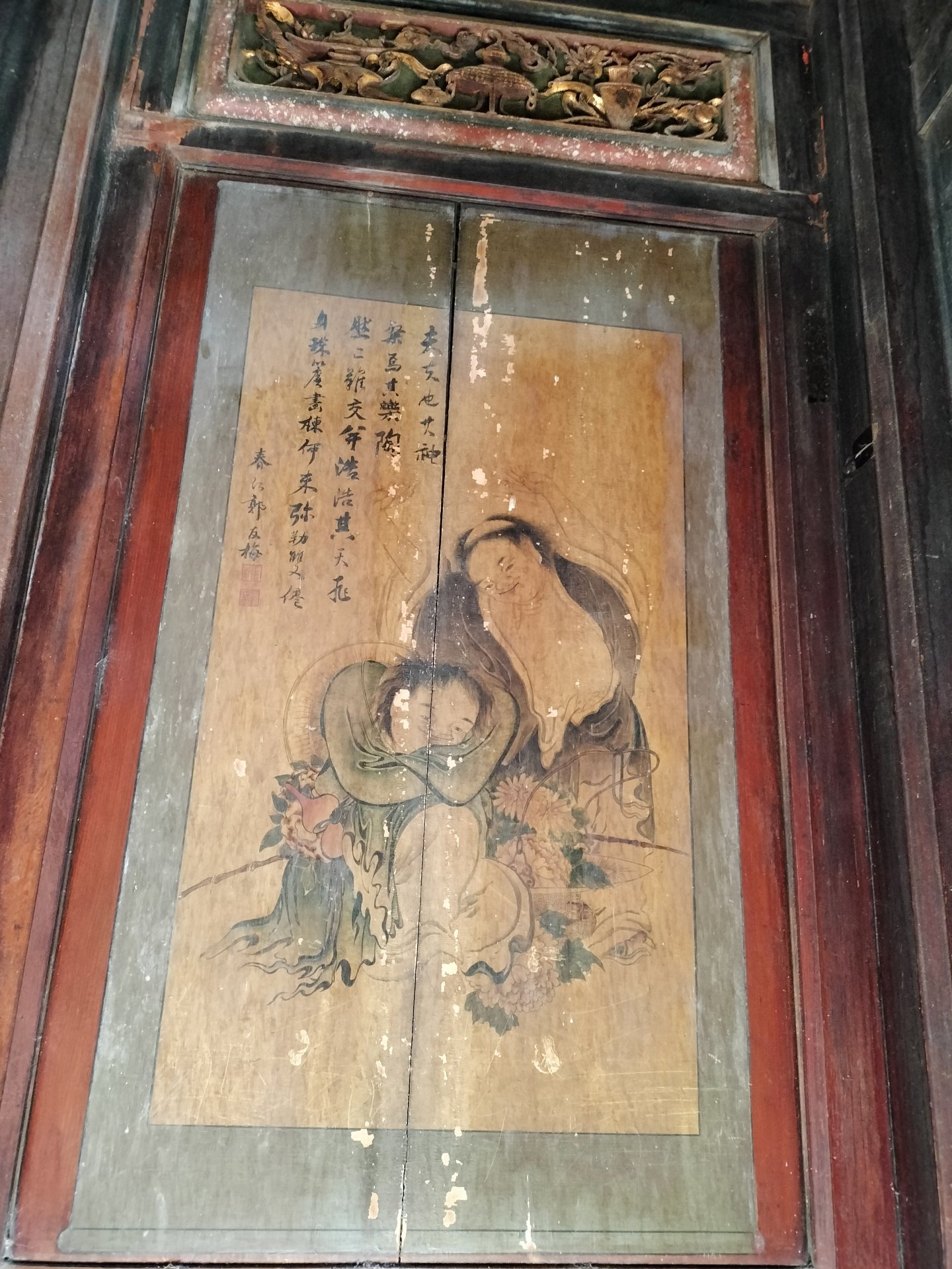 和合二聖為佛教寒山和拾得,相傳兩人出家前親如兄弟,卻共愛一女。當結婚即將來臨,寒山得知後即離家為僧,拾得也擔著女兒去尋找寒山。兩人相會後,皆出家為僧,並建立了寒山寺。