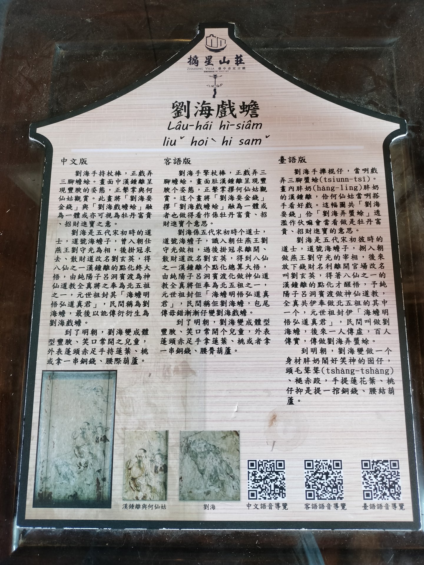 此畫中,劉海手持杖棒,戲弄三腳蟾蜍,呈現了歡愉活潑的畫面。在白晝的面前,中漢鍾離展現豐腆的交態,正擊掌輿何仙姑觀賞。畫中將「劉海耍金錢」與「劉海戲蟾蜍」融為一體,或可視為牡丹富貴、招財進實之象徵。
