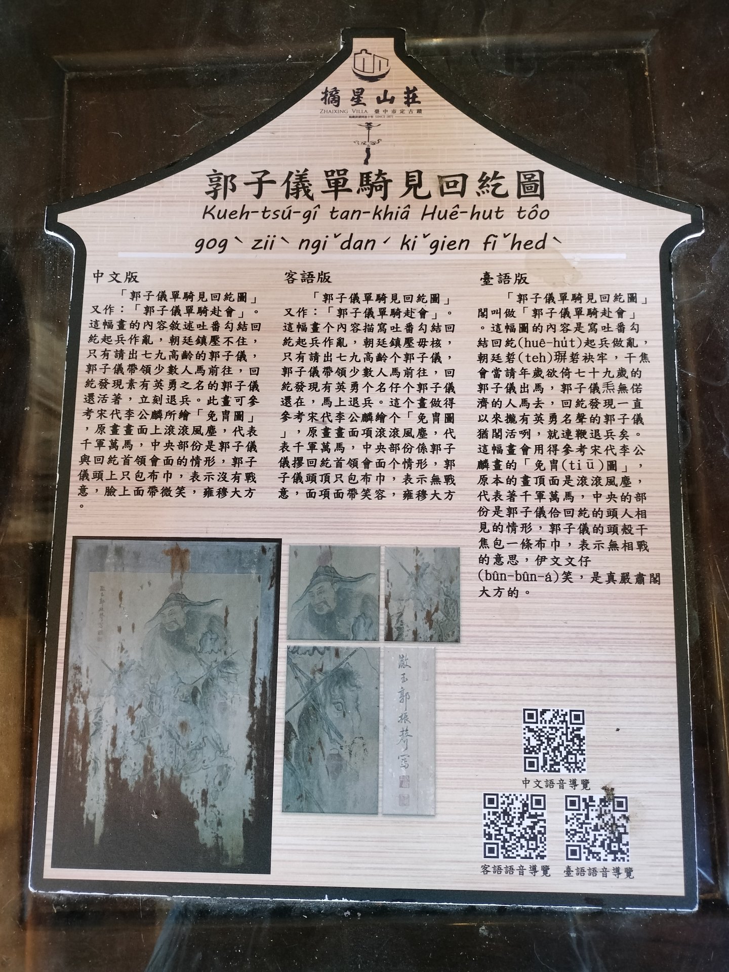 郭子儀單騎見回統圖」或稱「郭子儀單騎赴會」,描繪了郭子儀在吐蕃和回紇起兵作亂時,單騎前往會面的英勇場景。朝廷力不能壓制亂局,唯有請出七九高齡的郭子儀,他帶領少數人馬前往,令回紇見到活著的郭子儀,立即退兵。